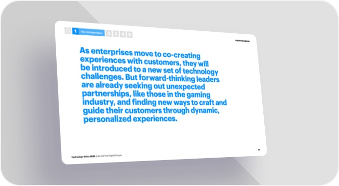 1 The I in Experience 2 3 4 5 #TECHVISION2020 As enterprises move to co-creating experiences with customers, they will be introduced to a new set of technology challenges. But forward-thinking leaders are already seeking out unexpected partnerships, like those in the gaming industry, and finding new ways to craft and guide their customers through dynamic, personalized experiences. Technology Vision 2020 | We, the Post-Digital People 40