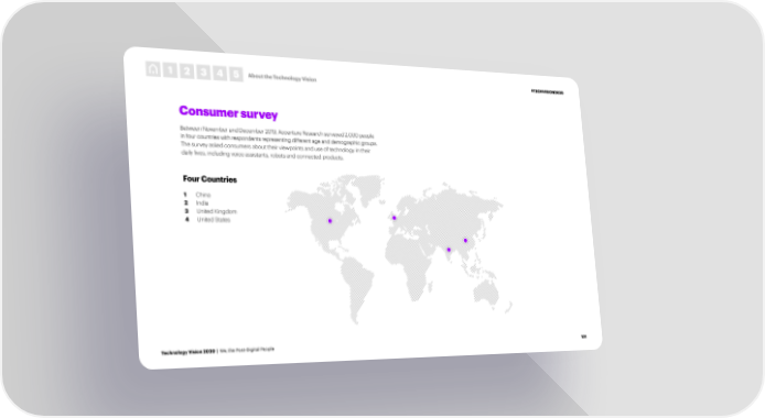 1 2 3 4 5 About the Technology Vision #TECHVISION2020 Consumer survey Between November and December 2019, Accenture Research surveyed 2,000 people in four countries with respondents representing different age and demographic groups. The survey asked consumers about their viewpoints and use of technology in their daily lives, including voice assistants, robots and connected products. Four Countries 1 China 2 India 3 United Kingdom 4 United States Technology Vision 2020 | We, the Post-Digital People 131