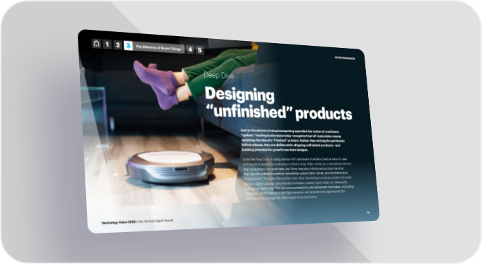 1 2 3 The Dilemma of Smart Things 4 5 #TECHVISION2020 Deep Dive Designing “unfinished” products Just as the advent of cloud computing upended the notion of a software “update,” leading businesses today recognize that IoT maturation means revisiting the idea of a “finished” product. Rather than striving for perfection before release, they are deliberately shipping unfinished products—and building potential for growth into their designs. Consider how Sony is using sensor-rich hardware to extend device value in new and exciting ways. The company’s robotic dog, Aibo, exists as a standalone device that consumers can purchase, but Sony has also introduced a cloud service that lets the robot companion remember subscribers’ faces, environments and 16 interactions. This lets Aibo evolve over time, becoming a unique product for each person. Sony’s design also lets the company create future value for owners by rolling out new tricks. The device’s connectivity and advanced hardware—including cameras, motion sensors and light sensors—all provide rich opportunity for developers to change the Aibo experience over time. TTechnology Vechnology Vision 2ision 202020 | 0 | WWee, , the Pthe Post-Digitost-Digital Pal Peopleeople 74