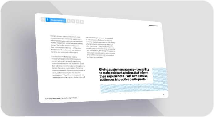 1 The I in Experience 2 3 4 5 #TECHVISION2020 Giving customers agency—the ability to make was available for just six hours. People swiped relevant choices that inform their experiences— to make choices and advance the plot, and will turn passive audiences into active participants, could then display those choices on their profiles, increase engagement and let businesses sidestep which provided an opportunity to match with many of the hurdles that are holding back other participants. On top of delivering a new, their customization initiatives. It will transform engaging and non-invasive way to connect and experience delivery from one-way streets to start conversations, time-boxing the experience dynamic and responsive collaborations. encouraged people to use the app at the same time, with the intention to help conversations Consider how the dating app Tinder is and matches move faster. increasing engagement and helping people connect with potential dates by introducing customized experiences into its platform. Rather than collecting more information and heightening behind-the-scenes customization efforts, the Giving customers agency—the ability company released a choose-your-own-adventure series, called “Swipe Night,” that required to make relevant choices that inform 14,15,16 participation. Each five-minute episode was their experiences—will turn passive released at 6pm local time on a Sunday night and audiences into active participants. Technology Vision 2020 | We, the Post-Digital People 27
