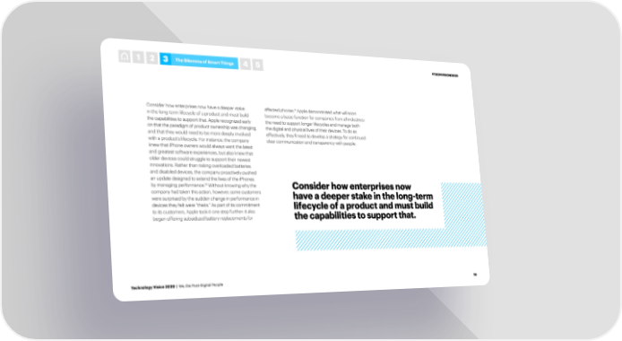 1 2 3 The Dilemma of Smart Things 4 5 #TECHVISION2020 11 Consider how enterprises now have a deeper stake affected phones. Apple demonstrated what will soon in the long-term lifecycle of a product and must build become a basic function for companies from all industries: the capabilities to support that. Apple recognized early the need to support longer lifecycles and manage both on that the paradigm of product ownership was changing, the digital and physical lives of their devices. To do so and that they would need to be more deeply involved effectively, they’ll need to develop a strategy for continued with a product’s lifecycle. For instance, the company clear communication and transparency with people. knew that iPhone owners would always want the latest and greatest software experiences, but also knew that older devices could struggle to support their newest innovations. Rather than risking overloaded batteries and disabled devices, the company proactively pushed an update designed to extend the lives of the iPhones 10 by managing performance. Without knowing why the Consider how enterprises now company had taken this action, however, some customers have a deeper stake in the long-term were surprised by the sudden change in performance in devices they felt were “theirs.” As part of its commitment lifecycle of a product and must build to its customers, Apple took it one step further: it also the capabilities to support that. began offering subsidized battery replacements for Technology Vision 2020 | We, the Post-Digital People 70