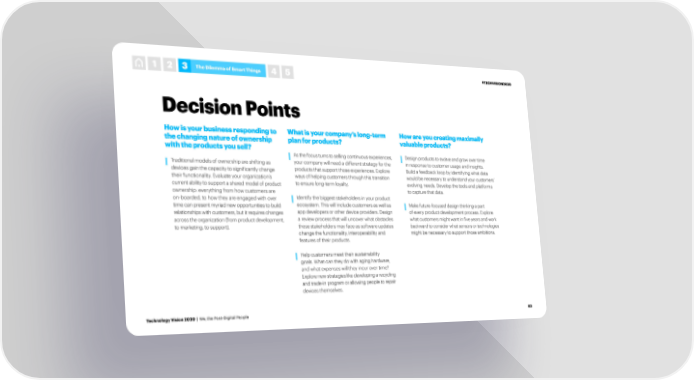 1 2 3 The Dilemma of Smart Things 4 5 #TECHVISION2020 Decision Points How is your business responding to What is your company’s long-term How are you creating maximally the changing nature of ownership plan for products? valuable products? with the products you sell? As the focus turns to selling continuous experiences, Design products to evolve and grow over time Traditional models of ownership are shifting as your company will need a different strategy for the in response to customer usage and insights. devices gain the capacity to significantly change products that support those experiences. Explore Build a feedback loop by identifying what data their functionality. Evaluate your organization’s ways of helping customers through this transition would be necessary to understand your customers’ current ability to support a shared model of product to ensure long-term loyalty. evolving needs. Develop the tools and platforms ownership: everything from how customers are to capture that data. on-boarded, to how they are engaged with over Identify the biggest stakeholders in your product time can present myriad new opportunities to build ecosystem. This will include customers as well as Make future-focused design thinking a part relationships with customers, but it requires changes app developers or other device providers. Design of every product development process. Explore across the organization (from product development, a review process that will uncover what obstacles what customers might want in five years and work to marketing, to support). these stakeholders may face as software updates backward to consider what sensors or technologies change the functionality, interoperability and might be necessary to support those ambitions. features of their products. Help customers meet their sustainability goals. What can they do with aging hardware, and what expenses will they incur over time? Explore new strategies like developing a recycling and trade-in program or allowing people to repair devices themselves. Technology Vision 2020 | We, the Post-Digital People 83