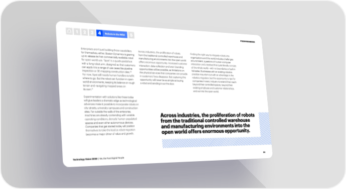 1 2 3 4 Robots in the Wild 5 #TECHVISION2020 Enterprises aren’t just building these capabilities Across industries, the proliferation of robots Finding the right way to integrate robots into for themselves, either. Boston Dynamics is gearing from the traditional controlled warehouse and organizations and the world includes challenges up to release its first commercially available robot manufacturing environments into the open world around talent, questions of human-computer for open-world use. “Spot” is a quadrupedal bot offers enormous opportunity. Increased customer interaction and a testbed that quite literally consists with a long robot arm, designed so that customers interaction, data collection and even branding of the whole world—with no boundaries or built-in can apply it to a range of use cases like pipeline opportunities will be possible, as limitations on fail-safes. Businesses with an existing robotics 20 inspection or 3D mapping construction sites. the physical services that companies can provide practice may start out with an advantage in the For now, Spot still needs human handlers to tell it in customers’ lives disappear. But capturing this robotics migration, but the opportunity is ripe for where to go. But the robot can function in open- opportunity will never be as simple as buying companies in every industry to extend their reach: world environments, keeping its balance on rough a robot and sending it out the door. beyond their controlled spaces, beyond their terrain and navigating mapped areas on existing employee and customer relationships, its own.21 and out into the open world. Experimentation with solutions like these today will give leaders a dramatic edge as technological advances make it possible to incorporate robots on city streets, university campuses and construction sites. Far outside the walls of the enterprise, machines are already contending with variable Across industries, the proliferation of robots operating conditions, densely human-populated from the traditional controlled warehouse spaces and even other autonomous devices. Companies that get started today will position and manufacturing environments into the themselves to take the lead as robot migration becomes a major driver of value and growth. open world offers enormous opportunity. Technology Vision 2020 | We, the Post-Digital People 94
