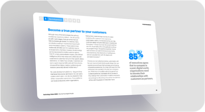 1 The I in Experience 2 3 4 5 #TECHVISION2020 Become a true partner to your customers Although many of the technologies that will truly helping them create the large volumes of content revolutionize experience delivery—like AR and 5G— needed to offer customers more experience are still in early stages, there are others that can customization options. Turned external, they can help help businesses get started. For instance, many customers design and personalize apps or experiences are already investing in machine learning to build themselves.24 Amazon Sumerian lets people build their recommendation systems. These systems have own AR, virtual reality (VR) or 3D applications without traditionally left little room for customer input or any programming or 3D graphics expertise. Anyone to escape echo chambers; however, the technology with Sumerian can build immersive environments can be repurposed to enable customer agency. and experiences, like classrooms or building tours, THE.FIT, a menu personalization engine, uses artificial and can populate them with 3D objects and % intelligence (AI) to help restaurants collaborate with animated characters.25 85 85 customers to customize menus for their specific dietary restrictions, no matter how complex. Customers can Choose-your-own-adventure stories, customization with of executives agree scan a quick response (QR) code with their phones, live user input and tools that let people design their own choose all their dietary needs or preferences and experiences are all ways that businesses are embracing that to compete in receive a personally tailored mobile menu.23 cooperative experiences. It’s a major shift away from how a post-digital world, enterprises have operated in the past, but a necessary organizations need No-code development platforms—drag-and-drop one. While there is incredible value to be gained from interfaces that anyone, technical or not, can use to curated experiences, businesses will only access it if to elevate their create custom apps—can also be adapted to help they redesign their customization models to emphasize relationships with deliver cooperative experiences. These platforms personal agency. Becoming a true partner to customers can boost productivity within organizations, will be a defining aspect of enterprises’ future. customers as partners. Technology Vision 2020 | We, the Post-Digital People 30