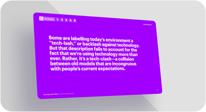 Introduction 1 2 3 4 5 #TE#TECHVISION2CHVISION2020200 Some are labelling today’s environment a “tech-lash,” or backlash against technology. But that description fails to account for the fact that we’re using technology more than ever. Rather, it’s a tech-clash—a collision between old models that are incongruous with people’s current expectations. TTechnology Vechnology Vision 2ision 202020 | 0 | WWee, , the Pthe Post-Digitost-Digital Pal Peopleeople 10