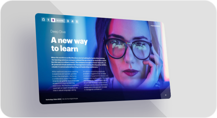 1 2 AI and Me 3 4 5 #TECHVISION2020 Deep Dive A new way to learn When the workforce at Red Nucleus started asking for leadership training, the learning solutions company enlisted the services of an executive coach. But this was no ordinary coach. The company brought in Coach Amanda, an AI-powered virtual assistant for management training developed by LEADx, 16 a leader in conversational learning and leadership enablement. While traditional executive coaching for advice concerning employee is expensive and typically granted problems, suggestions to increase to very few employees, deploying employee engagement or lessons on a collaborative system like Coach management fundamentals. The results Amanda can give far more employees are impressive: The company saw a access to an ongoing learning 33 percent increase in productivity, experience. Red Nucleus employees a 35 percent decrease in workplace could talk to Coach Amanda at any stress and a nine percent increase 17 time in natural language, asking in managerial confidence. Technology Vision 2020 | We, the Post-Digital People 54