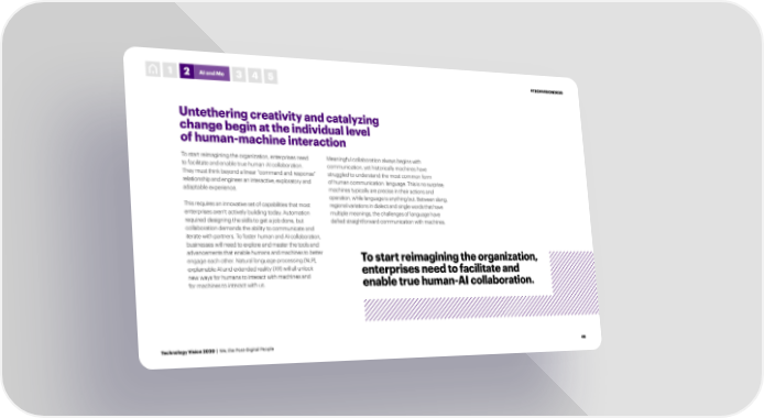 1 2 AI and Me 3 4 5 #TECHVISION2020 Untethering creativity and catalyzing change begin at the individual level of human-machine interaction To start reimagining the organization, enterprises need Meaningful collaboration always begins with to facilitate and enable true human-AI collaboration. communication, yet historically machines have They must think beyond a linear “command and response” struggled to understand the most common form relationship and engineer an interactive, exploratory and of human communication: language. This is no surprise; adaptable experience. machines typically are precise in their actions and operation, while language is anything but. Between slang, This requires an innovative set of capabilities that most regional variations in dialect and single words that have enterprises aren’t actively building today. Automation multiple meanings, the challenges of language have required designing the skills to get a job done, but defied straightforward communication with machines. collaboration demands the ability to communicate and iterate with partners. To foster human and AI collaboration, businesses will need to explore and master the tools and advancements that enable humans and machines to better To start reimagining the organization, engage each other. Natural language processing (NLP), explainable AI and extended reality (XR) will all unlock enterprises need to facilitate and new ways for humans to interact with machines and for machines to interact with us. enable true human-AI collaboration. Technology Vision 2020 | We, the Post-Digital People 48