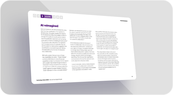 1 2 AI and Me 3 4 5 #TECHVISION2020 AI reimagined Work at Accenture Labs demonstrates this using Natarajan was declared the winner, but noted every workflow. Particularly, the company’s claims data from loan applications. If an applicant is the system’s potential, saying that if its ability payment process was designed to play to the 13 denied a loan, the system explains the reasons to grasp and contextualize information were strength of AI and humans working together. for the denial and offers the smallest number of paired with a human colleague’s skills in using Customers file claims with a chatbot that both changes the applicant would need to make to that information more subtly, it would make logs the claim details and instantly compares the 12 have the application approved, such as having for a powerful collaboration. claim to others within the Lemonade database— 10 more cash on hand or increasing annual income. a first wave of defense against fraud. If everything The process is also interactive: if an applicant Once enterprises enable the full scope of is okay, the claim can be paid out immediately can’t increase income, for example, they can human-AI collaboration, they can jump on the to the customer. If a claim is too complex or ask the system to make another suggestion that new opportunity before them—employing AI problematic, the AI shares the information with a 14 would lead to a successful approval. Making as an agent of change. Competitive advantage human agent, who steps in to manage the case. AI explainable turns a human-AI interaction is no longer about finding a faster way to do into a relationship. what’s already being done. Leaders in the future This unique division of labor is the root of will be the ones that can rapidly and continuously why Lemonade can offer competitive pricing IBM built a system that put many of these change, using AI to rethink and reimagine within the insurance industry. Fraud and the new capabilities into action. “Project Debater” everything—from the way their organizations administrative costs of complex bureaucracies combines IBM Watson’s natural language are structured, to the way they approach work, are two of the largest costs to insurance capabilities to listen to and parse human speech, to the value their enterprise creates. companies, and the company solves both by with a system that mines through an array of making AI a key part of the process. Meanwhile, newspaper and journal opinions to construct Look at Lemonade, a startup natively designed it also provides the customer with a simplified, an argument. In 2019, the company pitted the to use human-AI collaboration to disrupt the seamless insurance experience while making system against European Debate Champion insurance industry. At Lemonade, AI is embedded a human touchpoint available when it’s 11 15 Harish Natarajan in a live, unscripted debate. in the organization and present in nearly needed most. Technology Vision 2020 | We, the Post-Digital People 51