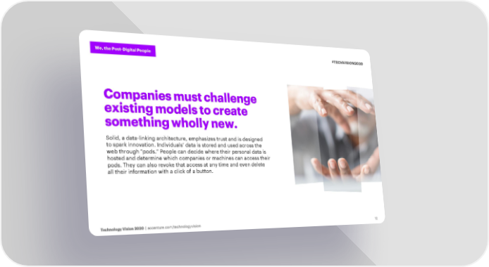 We, the Post-Digital People #TECHVISION2020 Companies must challenge existing models to create something wholly new. Solid, a data-linking architecture, emphasizes trust and is designed to spark innovation. Individuals’ data is stored and used across the web through “pods.” People can decide where their personal data is hosted and determine which companies or machines can access their pods. They can also revoke that access at any time and even delete all their information with a click of a button. Technology Vision 2020 | accenture.com/technologyvision 12