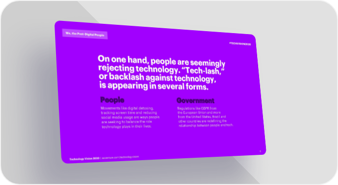 We, the Post-Digital People #TECHVISION2020 On one hand, people are seemingly rejecting technology. “Tech-lash,” or backlash against technology, is appearing in several forms. People Government Movements like digital detoxing, Regulations like GDPR from tracking screen time and reducing the European Union and more social media usage are ways people from the United States, Brazil and are seeking to balance the role other countries are redefining the technology plays in their lives. relationship between people and tech. Technology Vision 2020 | accenture.com/technologyvision 6