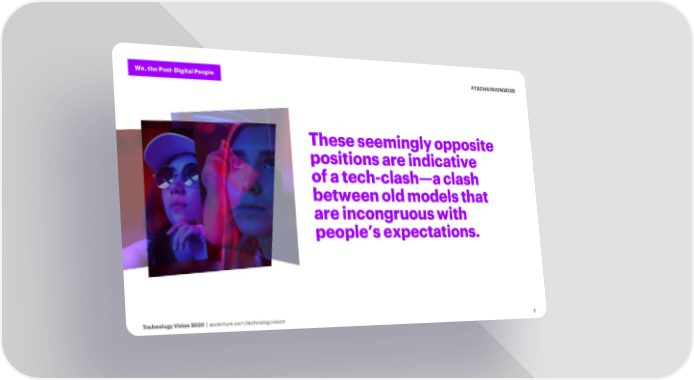 We, the Post-Digital People #TECHVISION2020 These seemingly opposite positions are indicative of a tech-clash—a clash between old models that are incongruous with people’s expectations. Technology Vision 2020 | accenture.com/technologyvision 8