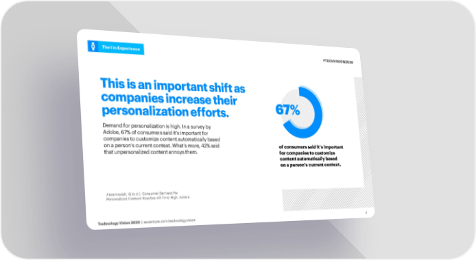 The I in Experience #TECHVISION2020 This is an important shift as companies increase their personalization efforts. Demand for personalization is high. In a survey by Adobe, 67%of consumers said it’s important for companies to customize content automatically based on a person’s current context. What’s more, 42% said that unpersonalizedcontent annoys them. of consumers said it’s important for companies to customize content automatically based on a person’s current context. Abramovich, G (n.d.). Consumer Demand for Personalized Content Reaches All-Time High. Adobe. Technology Vision 2020 | accenture.com/technologyvision 4