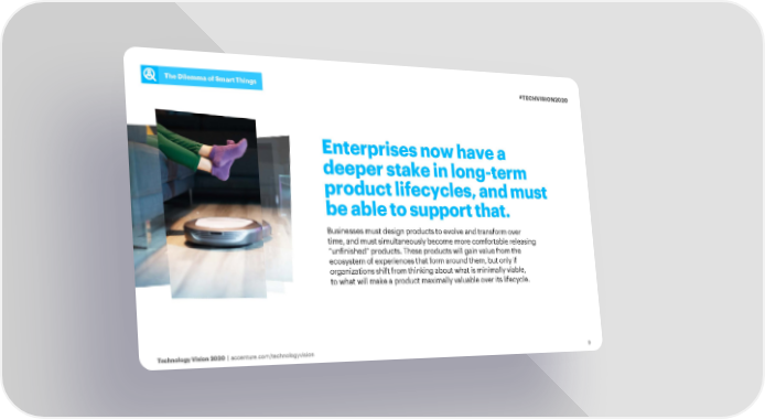 The Dilemma of Smart Things #TECHVISION2020 Enterprises now have a deeper stake in long-term product lifecycles, and must be able to support that. Businesses must design products to evolve and transform over time, and must simultaneously becomemore comfortablereleasing “unfinished” products. These products will gain value from the ecosystem of experiences that form around them, but only if organizations shift from thinking about what is minimally viable, to what will make a product maximally valuable over its lifecycle. Technology Vision 2020 | accenture.com/technologyvision 9