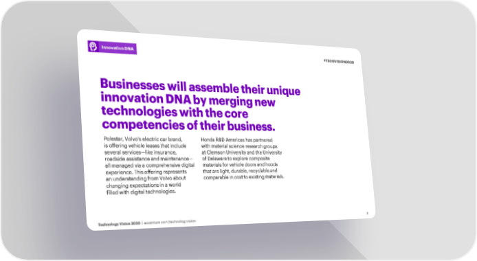 Innovation DNA #TECHVISION2020 Businesses will assemble their unique innovation DNA by mergingnew technologies with the core competencies of their business. Polestar, Volvo’s electric car brand, Honda R&D Americas has partnered is offering vehicle leases that include with material science research groups several services—like insurance, at Clemson University and the University roadside assistance and maintenance— of Delaware to explore composite all managed via a comprehensive digital materials for vehicle doors and hoods experience. This offering represents that are light, durable, recyclable and an understanding from Volvo about comparable in cost to existing materials. changing expectations in a world filled with digital technologies. Technology Vision 2020 | accenture.com/technologyvision 8