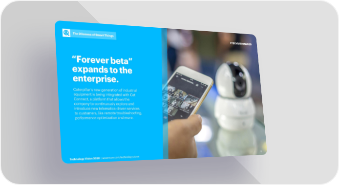 TThe he DiDilemlemmama ofof SSmamarrt t TThihingsngs #TECHVISION2020 “Forever beta” expands to the enterprise. Caterpillar’s new generation of industrial equipment is being integrated with Cat Connect, a platform that allows the company to continuously explore and introduce new telematics-driven services to customers, like remotetroubleshooting, performance optimization and more. TeTechchnnoolologygy VisVisioionn 22002200 | | accaccentuenturere..ccomom//tteecchhnnolologyogyvvisioisionn 6