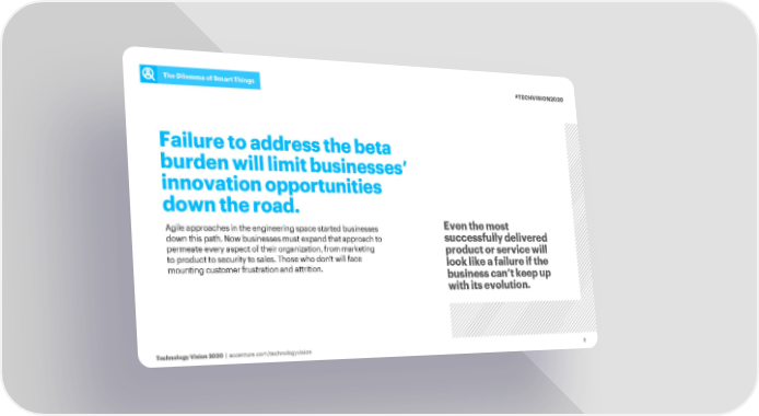 The Dilemma of Smart Things #TECHVISION2020 Failure to address the beta burden will limit businesses’ innovation opportunities down the road. Agile approaches in the engineering space started businesses Even the most down this path. Now businesses must expand that approach to successfully delivered permeate every aspect of their organization, from marketing product or service will to product to securityto sales. Those who don'twill face look like a failure if the mounting customerfrustration and attrition. business can’t keep up withits evolution. Technology Vision 2020 | accenture.com/technologyvision 8