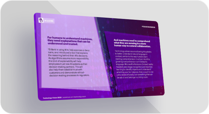AI and ME #TECHVISION2020 For humans to understand machines, And machines need tocomprehend theyneed explanations that can be what they are sensing in a more understood and trusted. human way to extend collaboration. TD Bank is using AI to help approve or deny Technology advances are allowing AI systems loans, andintroduced a tool that explains to better understand natural language in the reasoning behind their AI's decisions. context,similar to the way humans learn As algorithms assume more responsibility, reading comprehension in school. And this this kind ofexplainabilitywill help growing comprehension isn’t limited to employees trust new AI systems as their language.Microsoft’s HoloLens 2 mixed reality decision-making partners. This will headset uses image recognition and machine alsohelp themestablish trust with learning to identify objects and understand customers and demonstrate ethical- what they are: for instance, that a couch is not decision-making processes to regulators. just a series of pixels, but something that can be sat on and belongs in a living room. Technology Vision 2020 | accenture.com/technologyvision 8