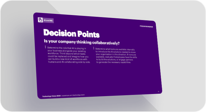 AI and ME #TECHVISION2020 Decision Points Is your company thinking collaboratively? ⎮Determine the role that AI is playing in ⎮Determine what tools are available internally your business alongside your existing to introduce the AI solutions needed to move workforce. Think beyond which tasks your organization in this direction. If none are could be replaced and imagine how you available, evaluate if employees have the skills can build a new kind of workforce with to build the solutions, or engage partners humans and AI collaborating side by side. to generate the necessary capabilities. Technology Vision 2020 | accenture.com/technologyvision 14