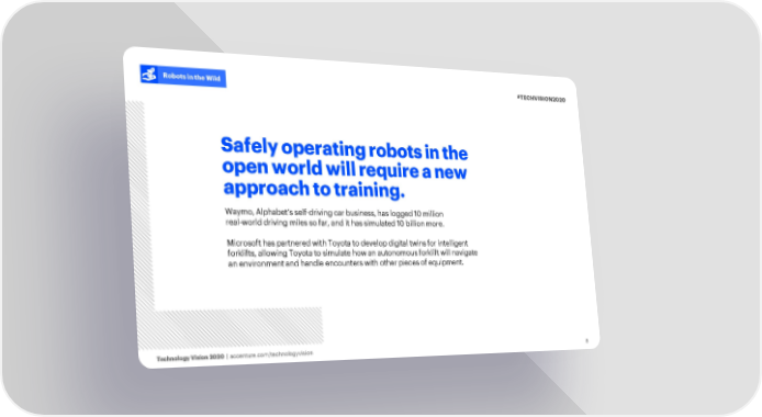 Robots in the Wild #TECHVISION2020 Safely operating robotsin the open world will require a new approach to training. Waymo, Alphabet’s self-driving car business, has logged 10 million real-world driving miles so far, and it has simulated 10 billion more. Microsoft has partnered with Toyota to develop digital twins for intelligent forklifts, allowing Toyota to simulate how an autonomous forklift will navigate an environment and handle encounters with other pieces of equipment. Technology Vision 2020 | accenture.com/technologyvision 8