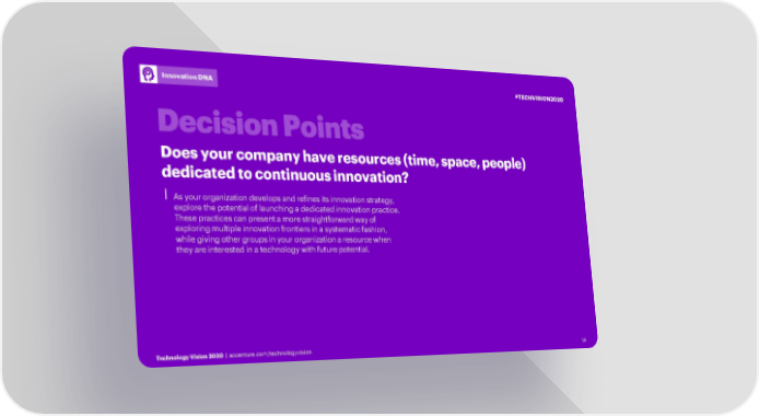 Innovation DNA #TECHVISION2020 Does your company have resources (time, space, people) dedicated to continuous innovation? ⎮As your organization develops and refines its innovation strategy, explore the potential of launching a dedicated innovation practice. These practices can present a more straightforward way of exploring multiple innovation frontiers in a systematic fashion, while giving other groups in your organization a resource when they are interested in a technology with future potential. Technology Vision 2020 | accenture.com/technologyvision 1414