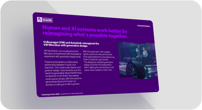 AI and ME #TECHVISION2020 Human and AI systems work better by reimagining what’s possible together. Volkswagen (VW) and Autodesk reimagined the VW Microbus with generative design. VW decided to reconceptualize their With this approach, VWcreated Microbus, andpartnered with Autodesk to lighter parts and reduced the time experiment with generative design tools. from development to manufacturing from 1.5 years to just months. These tools enabled a collaborative The designers credited generative partnership between human and design and their AI collaboration machine. The humans set cleaner and with creating structures they could greener design requirements, and the never have created on their own. machine generated ideas that fit those constraints. From there, the parties continued to iterate, with the machine generating ideas and human co- workers curating and refining them. Technology Vision 2020 | accenture.com/technologyvision 5