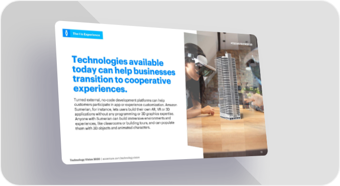 The I in Experience ##TTECHVECHVISISIONION22020200 Technologies available today can help businesses transition to cooperative experiences. Turned external, no-code development platforms can help customers participate in app or experience customization. Amazon Sumerian, for instance, lets users build their own AR, VR or 3D applications without any programming or 3D graphics expertise. Anyone with Sumerian can build immersive environments and experiences, like classrooms or building tours, and can populate them with 3D objects and animated characters. Technology Vision 2020 | accenture.com/technologyvision 10