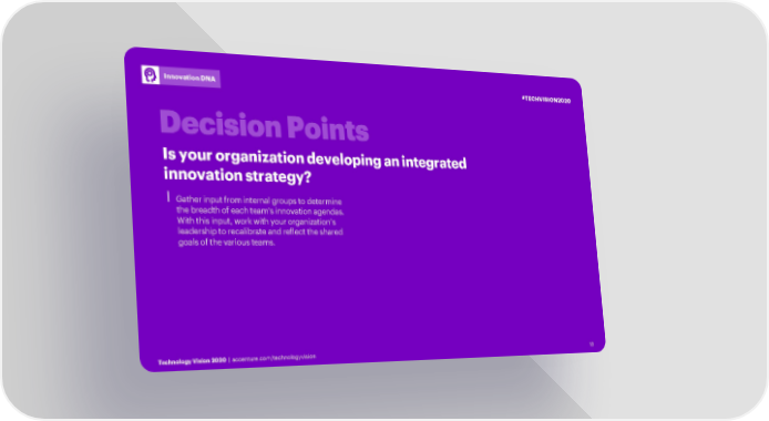 Innovation DNA #TECHVISION2020 Is your organization developing an integrated innovation strategy? ⎮Gather input from internal groups to determine the breadth of each team’s innovation agendas. With this input, work with your organization’s leadership to recalibrate and reflect the shared goals of the various teams. Technology Vision 2020 | accenture.com/technologyvision 1313