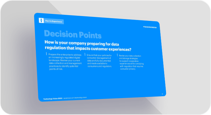 The I in Experience #TECHVISION2020 How is your company preparing for data regulation that impacts customer experiences? ⎮Prepare the enterprise to address ⎮ Ensure that your policies for ⎮Revise your data collection an increasingly regulated digital consumer management of and storage strategies landscape. Review your current data are fully documented to support cooperative data collection and management and made available to experiences while complying practices to identify potential consumers and regulators. with regulation that requires points of risk. consumer privacy. Technology Vision 2020 | accenture.com/technologyvision 15