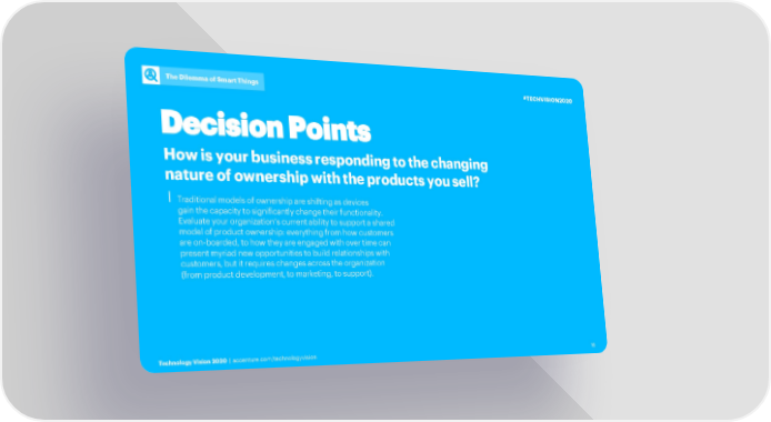 The Dilemma of Smart Things #TECHVISION2020 Decision Points How is your business responding to the changing nature of ownership with the products you sell? ⎮Traditional models of ownership are shifting as devices gain the capacity to significantly change their functionality. Evaluate your organization’s current ability to support a shared model of product ownership: everything from how customers are on-boarded, to how they are engaged with over time can present myriad new opportunities to build relationships with customers, but it requires changes across the organization (from product development, to marketing, to support). Technology Vision 2020 | accenture.com/technologyvision 16