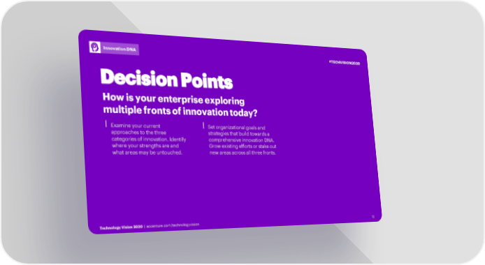 Innovation DNA #TECHVISION2020 Decision Points How is your enterprise exploring multiple fronts of innovation today? ⎮Examine your current ⎮Set organizational goals and approaches to the three strategies that build towards a categories of innovation. Identify comprehensive innovation DNA. where your strengths are and Grow existing efforts or stake out what areas may be untouched. new areas across all three fronts. Technology Vision 2020 | accenture.com/technologyvision 1212