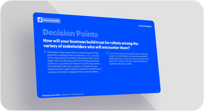 Robots in the Wild #TECHVISION2020 How will your business build trust for robots among the variety of stakeholders who will encounter them? ⎮Take steps to help people who are interacting with these ⎮To minimize potential disruptions your robots may devices to understand machine behavior. Your company cause in uncontrolled environments, take steps to will be responsible for handling interactions with a much design devices in a way that clearly conveys intent. larger array of individuals, and many of these people will Work with industry partners to standardize these not be your customers, so these encounters may be their systems whenever possible. first interaction with your company. Consider the user experience and human-machine interaction expertise your company will need to navigate these uncertain waters. Technology Vision 2020 | accenture.com/technologyvision 17